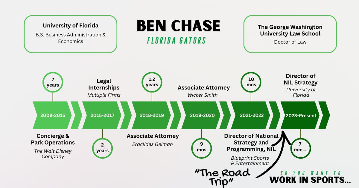 Ben went from Disney to community college to law school to NIL. Each step added a new skill and perspective. There is no single blueprint for breaking into sports.