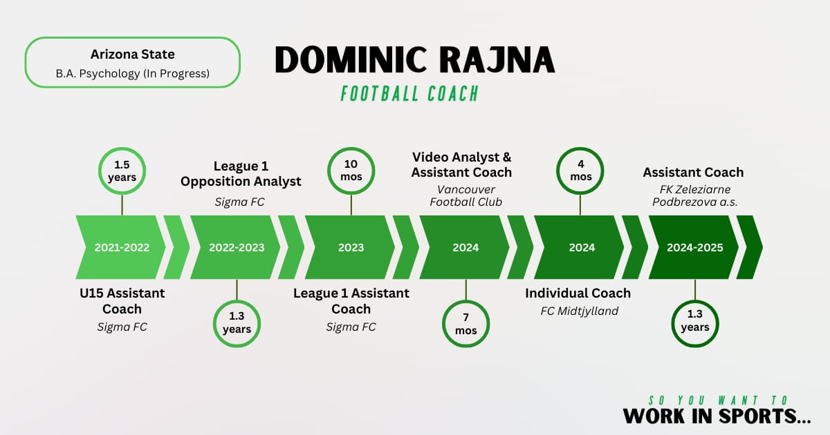 Today, Dominic holds a UEFA A License and is actively pursuing his next opportunity, with the long-term goal of becoming a head coach in a top 40 league by the age of 22. Alongside his coaching career, he is completing a psychology degree remotely through Arizona State University, fitting coursework around his professional schedule.