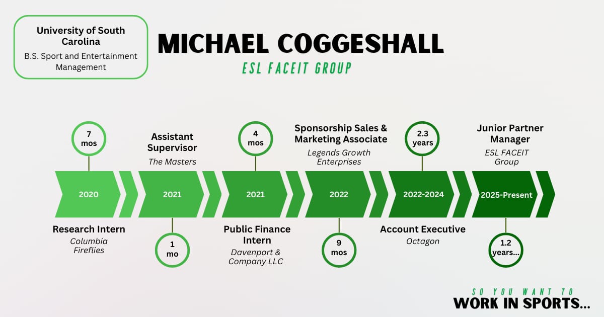 Michael benefited from exceptional early access. South Carolina opened doors, and working The Masters gave him exposure most students never experience before graduation. On paper, he had done everything right, yet even that was not enough to coast directly into a full-time role in sports. After college, when things didn't immediately go his way, he stuck with it, took a job outside the industry to support himself, and continued applying while trusting that the foundation he built would eventually create an opening. He always kept pushing towards the goal, and when the opportunity at Octagon came, he was ready.